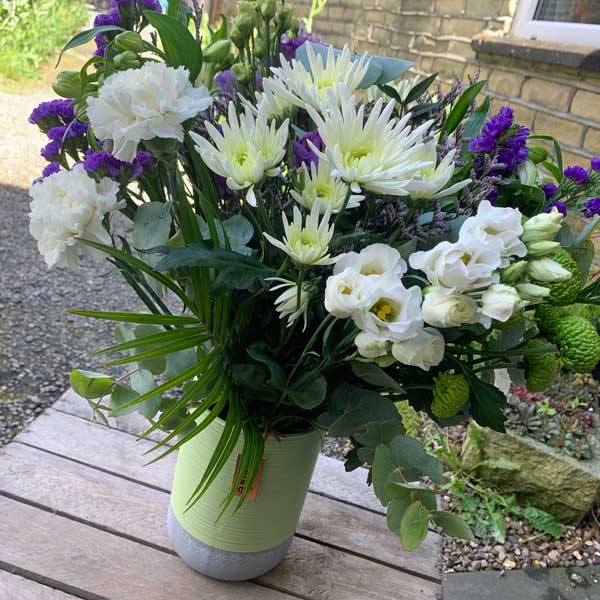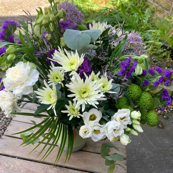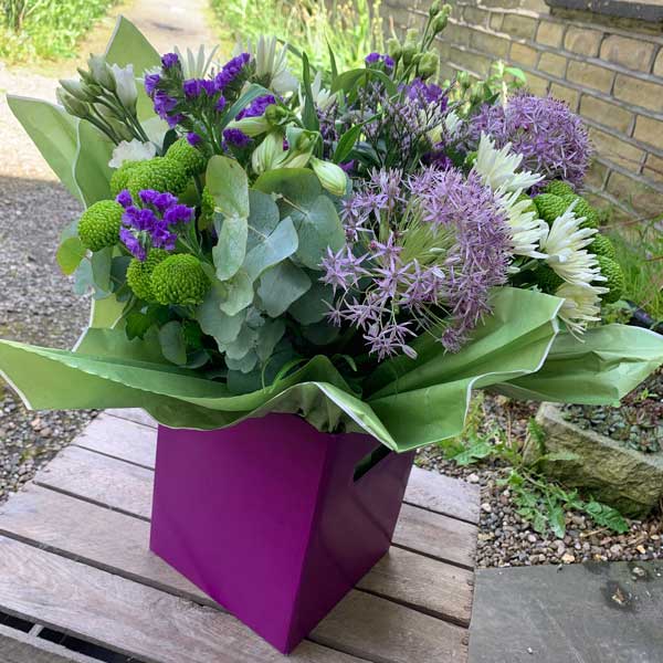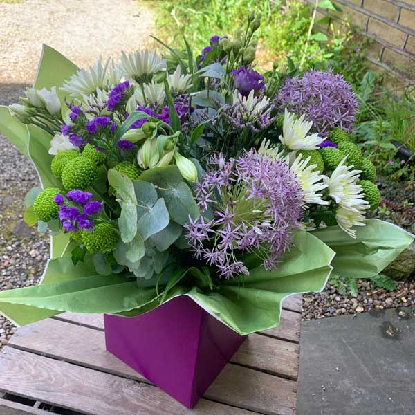 - A delightful mix of seasonal purple, white, and lime flowers (exact varieties may differ)