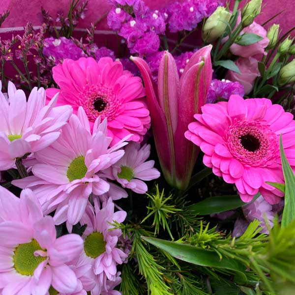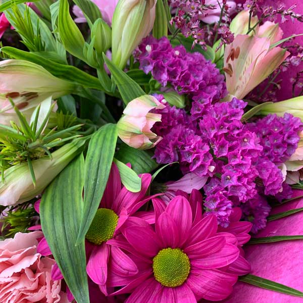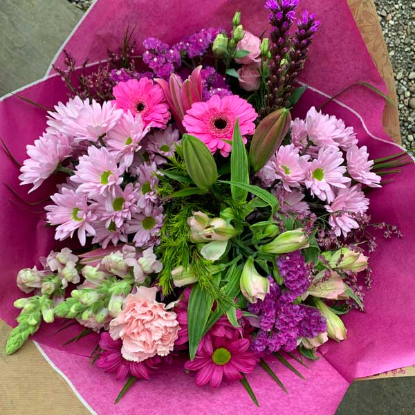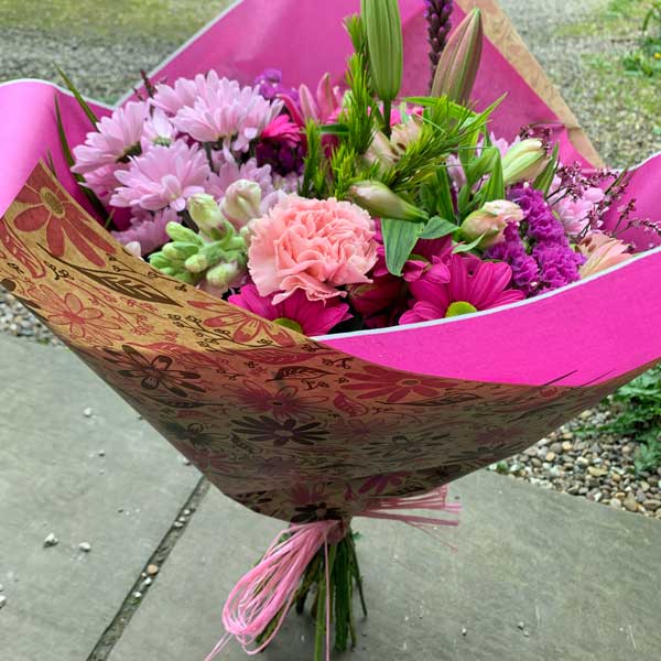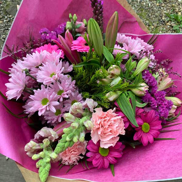 Such a lovely hand-tied bouquet in pretty pinks with luscious green foliage all wrapped in our biodegradable ecowrap.